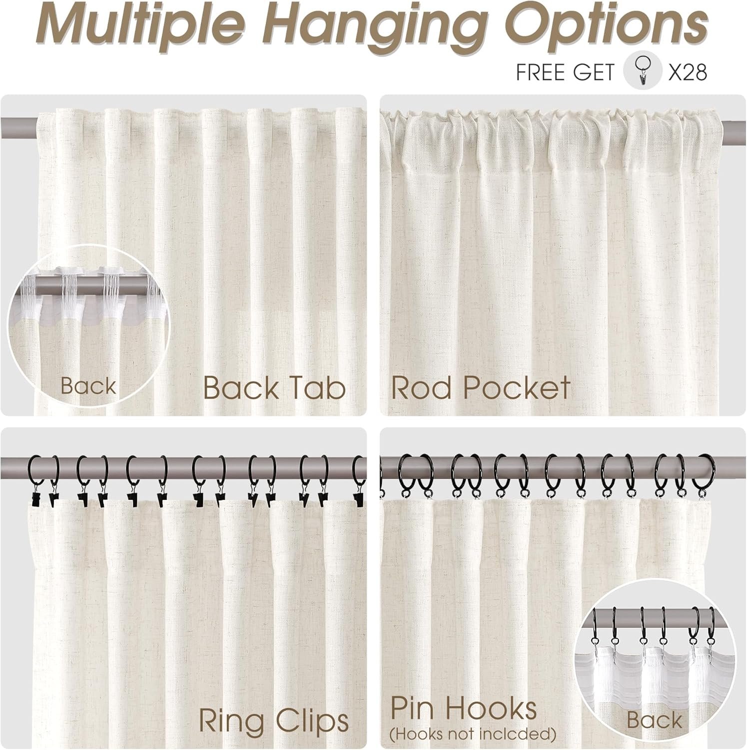 • READY MADE: 2 panels of linen curtain per package. Each curtain panel measures 52″ wide x 96″ long. 1.Classic Back Tab Look- With hidden back loop hanging on curtain 2.From the rod pocket for a modern look 3.Clips Look-Simply using clips on curtain header 4.Hooks look-using shower hooks, pin hooks, and pleat hooks for easy pull.(hooks are not included)
