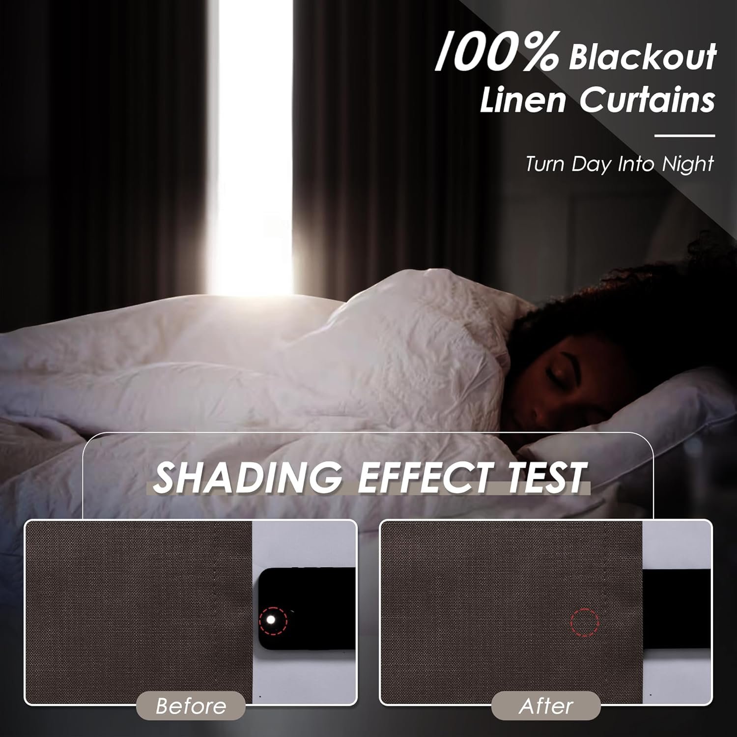 • 100% BLACKOUT: The blackout coating is attached directly to the back of the linen drapes. Opaque fabric totally blocks out light to darken any room for your better sleep, protects the floors and furniture from color fading and reduces noise from the outside. Ideal for bedroom, living room, nurseries, home office, playroom