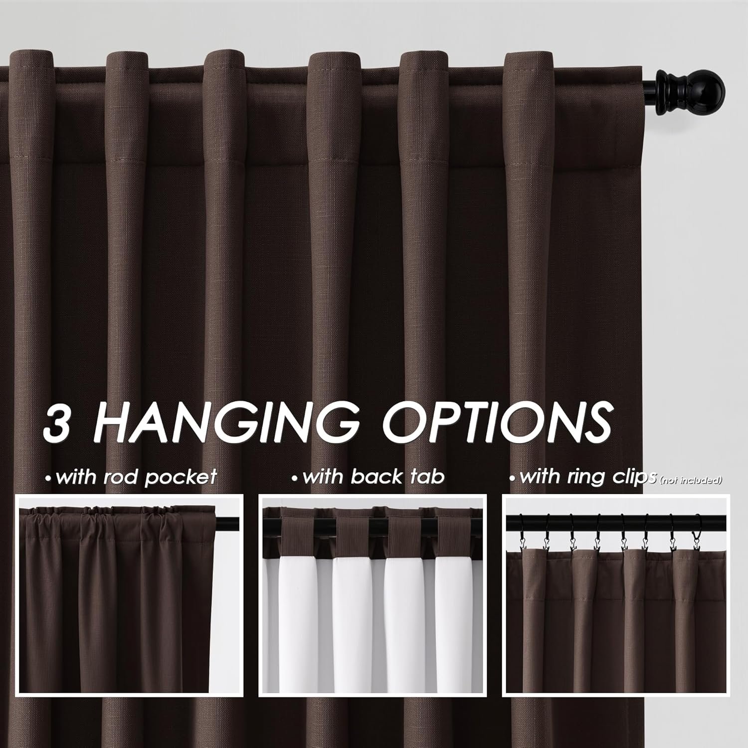 • READY MADE: Set of 2 Linen Blackout Curtain Panels per package.Each panel measures 52 inches wide by 84 inches long. Top design of Back tab & loop pocket provide 3 hanging options. Hanging the blackout linen curtain panels from the back tabs for an elegant pleated style or use the rod pocket to create a more casual gathered look.use clip rings for easy slide open and closed (clip rings are not included)